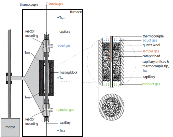Zur effektiven Auslegung von Reaktoren für die chemische Industrie ist die Kenntnis der reaktionstechnischen Eigenschaften der eingesetzten Katalysatoren von zentraler Bedeutung. Die hierfür typischerweise genutzten formalkinetischen Ansätze beschreiben dabei mathematisch den zu erzielenden Umsatz, gekoppelt mit der der Reaktionsenthalpie können hiermit auch Vorhersagen zur Wärmefreisetzung getroffen werden. Für die Messung der für das Aufstellen dieser Ansätze benötigten experimentellen Daten wurde am EBI ceb eine Versuchsapparatur (vgl. Abb. 1) aufgebaut. Durch die ortsaufgelöste Temperatur- Konzentrationsmessung der Reaktionsgase kann der Reaktionsverlauf in Abhängigkeit der angelegten Versuchsbedingungen, wie Temperatur und Druck, bestimmt werden